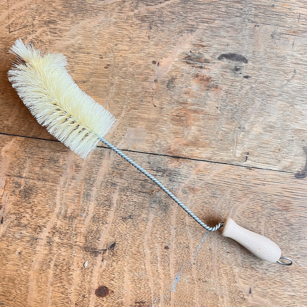 A handy well made tool that fits into a small necked bottle. The wire stem is bendable and the wooden grip makes it handy to hang onto while you clean out those bottles.