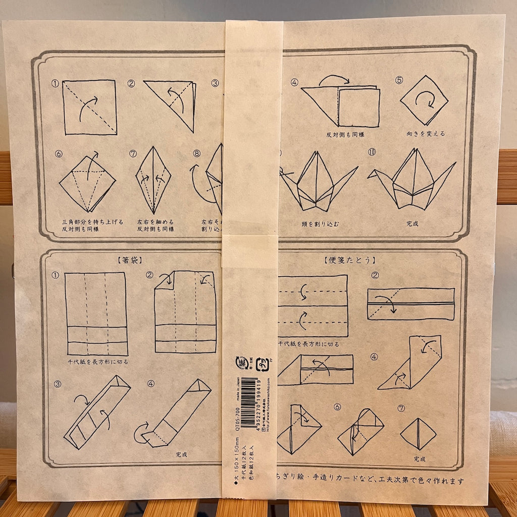 - Includes folding instructions for a crane, chopstick envelope, and letter envelope