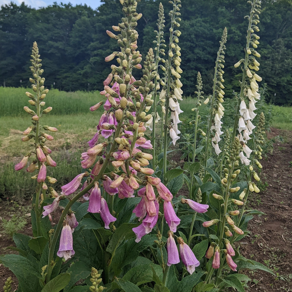 A lovely biennial digitalis mix in complementary shades of purple, pink, and white. If planted early, some plants will bloom the first year; the full mix should reveal itself the following year. Self sows readily if happy. Reaches heights of 2-3'. Will tolerate partial shade. Note that Foxglove is poisonous if ingested.