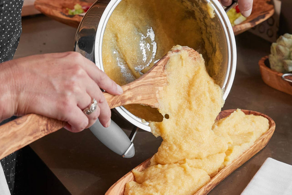 Introducing the largest wooden spoon I have ever encountered, the Italian Olivewood Polenta Spoon. This signature wooden kitchen utensil was developed with the "function first" philosophy of our artisans from Umbria, Italy. To create the most comfortable hold, Italian olive wood is crafted for an ultrasmooth finish, and a natural grip. Use this spoon for mixing, stirring and serving.