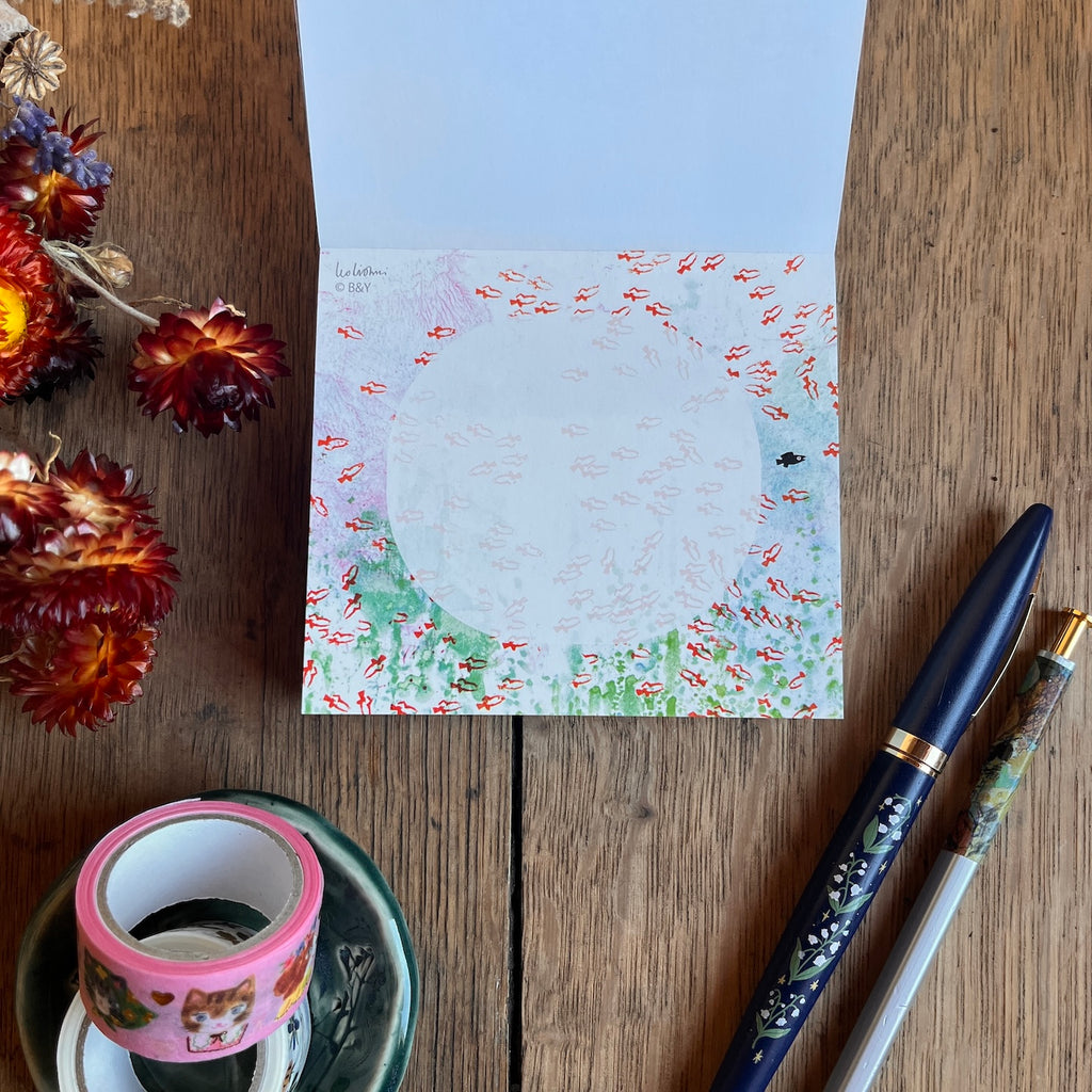 New by Leo Lionni ! This perfectly delightful Swimmy memo block can be used to write a quick note to someone or maybe a list of things that you want to remind yourself to do. There are four different images of illustrations from Lionni's 1963 children's book which was awarded a Caldecott Honor. Cute stationery from Japan makes a perfect gift for a friend. The images are unique and delightful. These beautiful notes will put a smile on your face and a warm feeling in your heart.