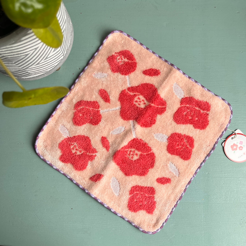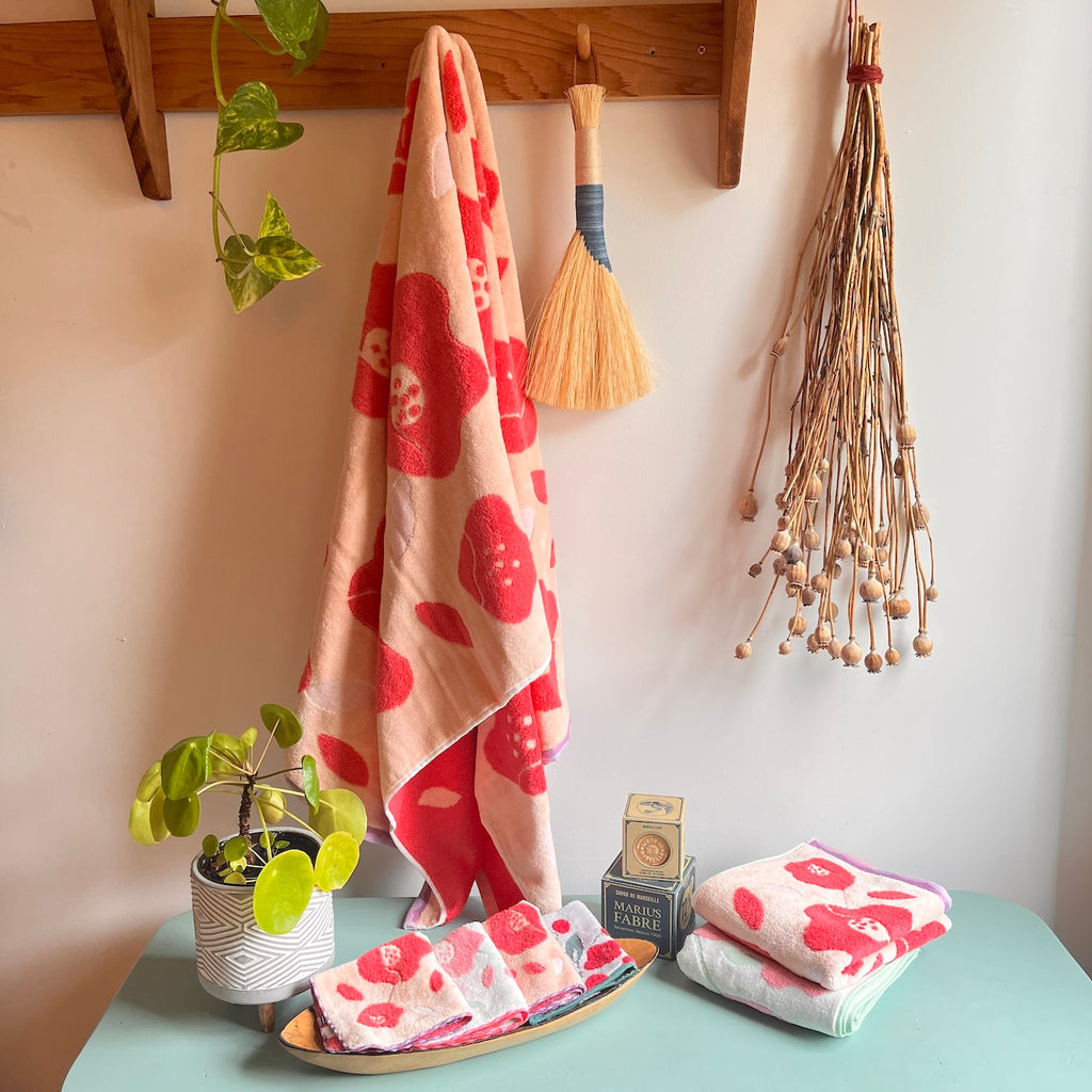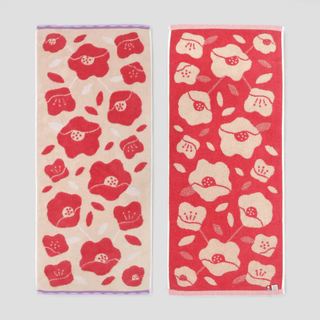 Iori’s original Tsubaki series in Red is renewed with a contemporary palette that sets the classic camellia motif against plush, zero-twist cotton. Woven from 100 % untwisted yarn, the fabric opens fully for swift absorbency, long-lasting softness, and minimal lint. A sheared-pile finish smooths the surface to a velvety touch, while tonal hems mirror the flower’s layered petals for a subtle accent. Every size bears the Imabari certification mark, ensuring the towels meet strict standards for absorbency and durability.
