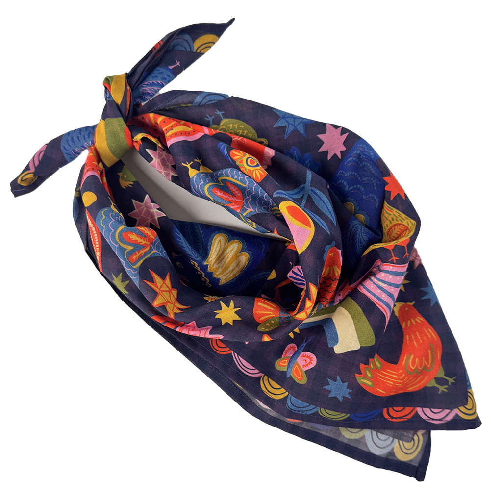 Meet Matilda, the debut design in Handker's Studio Series — where art takes the spotlight. Straight from Beth’s paintbrush to your neck (or hair, or wall), Matilda is a wild flight of color and pattern. Birds swoop, chickens chirp and butterflies flit across a deep navy blue and plum plaid sky, layered with folk-art inspired blooms, stars, and just the right dose of chaos. She’s joyful, bold, and full of artistic personality — the kind of bandana that refuses to sit quietly in a drawer.
