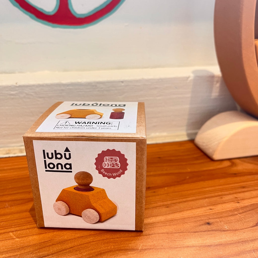 This cute little ochre wooden toy car comes with a maroon wooden figure, which can be taken out of the car. Perfect as addition to your Lubu Town construction sets, but also a nice little present on its own. Suitable for children between 3 and 8 years. Made in Europe with natural beech wood.