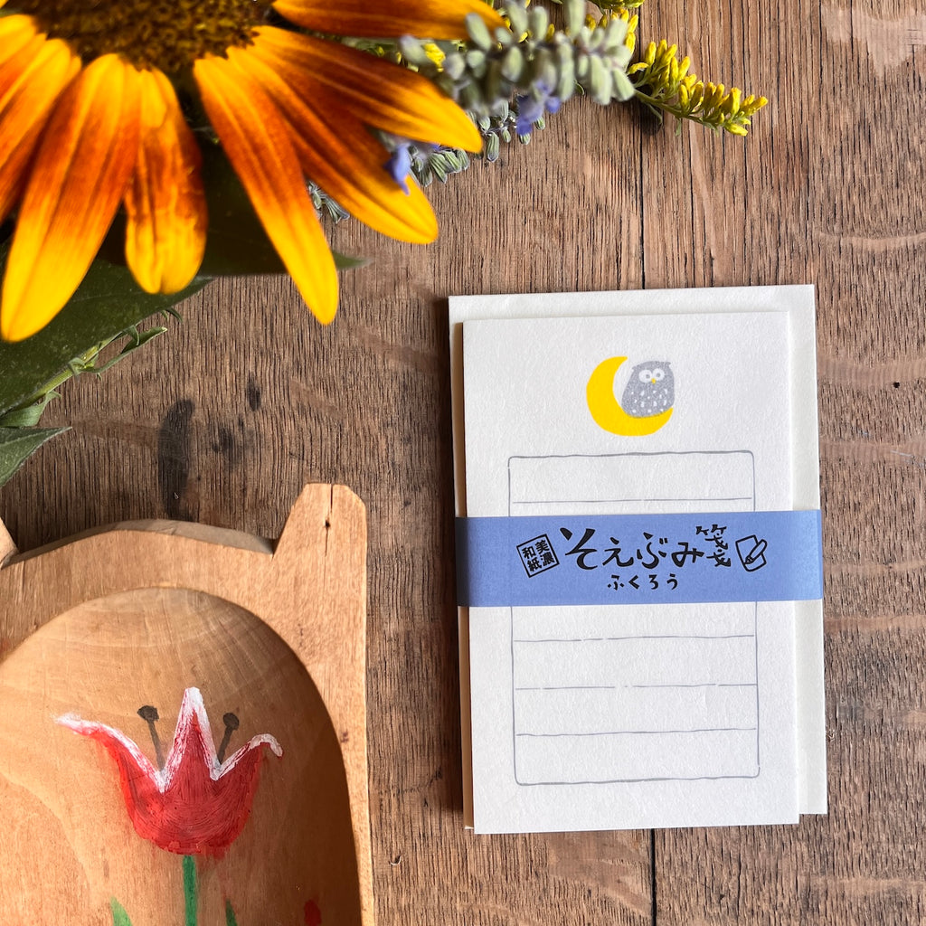 Furukawa Paper Works' popular Soebumi paper pad! This set includes a small palm-sized letter pad with envelopes featuring an owl & moon design.