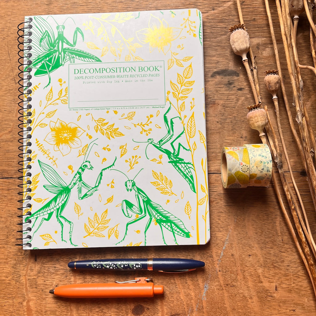 With forelegs clasped in a posture of devotion, Praying Mantises may look meek, but those beseeching raptorials can be strong enough to trap small birds. Lively green Praying Mantises adorn the covers of this Praying Mantises Coilbound Decomposition Notebook.