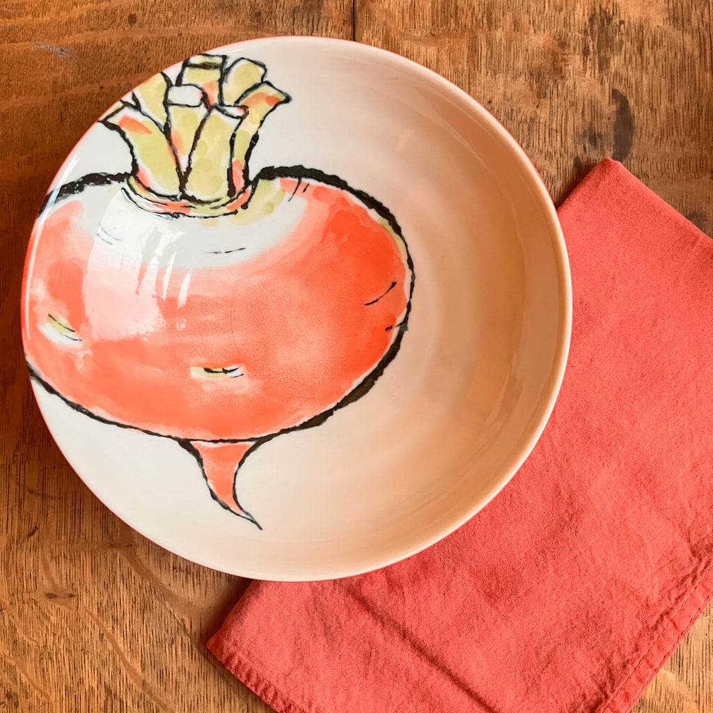 The Red Turnip Mino Ware bowl is a fun bowl from a series depicting vegetables with simple brush strokes. It is fun to eat the same vegetable that matches the pattern on the bowl. Referred to as "asobigokoro" (a term that describes playfulness) it describes the spirit of matching the dish with the container is also a result of the playfulness of hospitality.