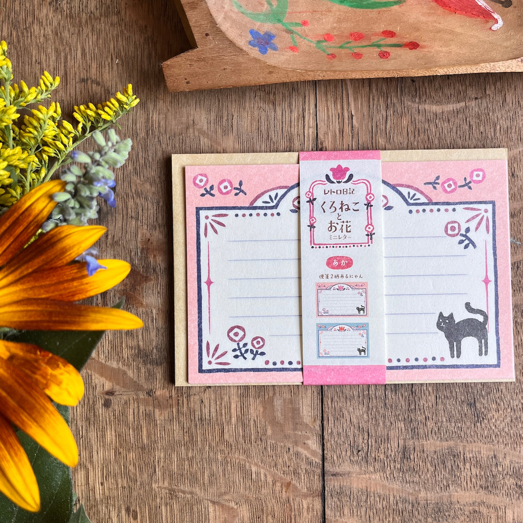 Retro Black Cat & Flower | Mini Letter Writing Set in Red