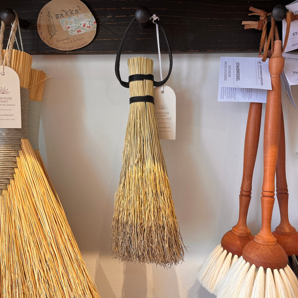 Tiger tiger! Naturally dyed small brush with black nylon wrap and leather hang tie. A simple small brush designed by Cynthia at Sunhouse Craft, based off the start of a hawks tail broom- classic meets modern in their sturdy utilitarian sweep.
